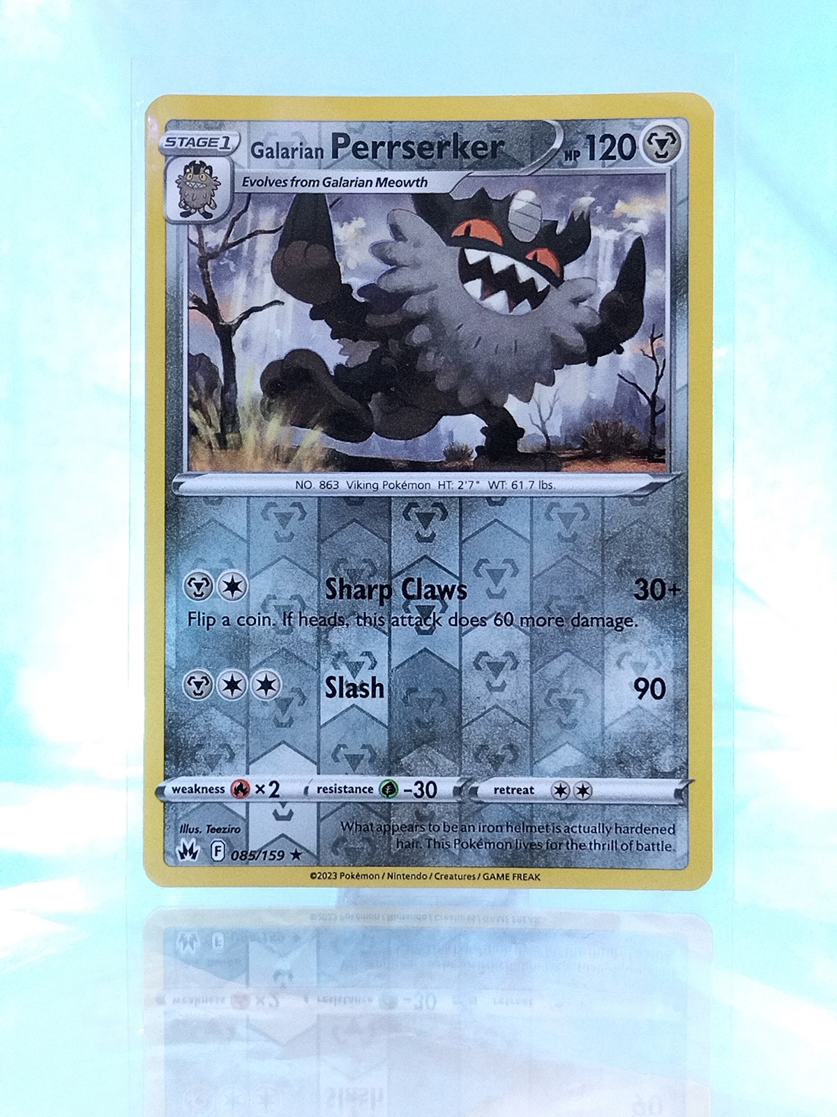Galarian Perrserker from the Pokémon Crown Zenith expansion.View Crown Zenith expansion